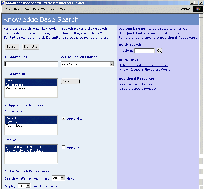 where servername is the TCP / IP name of the machine where ProblemTracker is installed and workgroup is the name of the ProblemTracker workgroup you created as the Knowledge Base. An example of a Search Page is shown in the image below. The Search Page is configured with default settings. A detailed explanation of the default settings can be found in the section Using the Knowledge Base template.