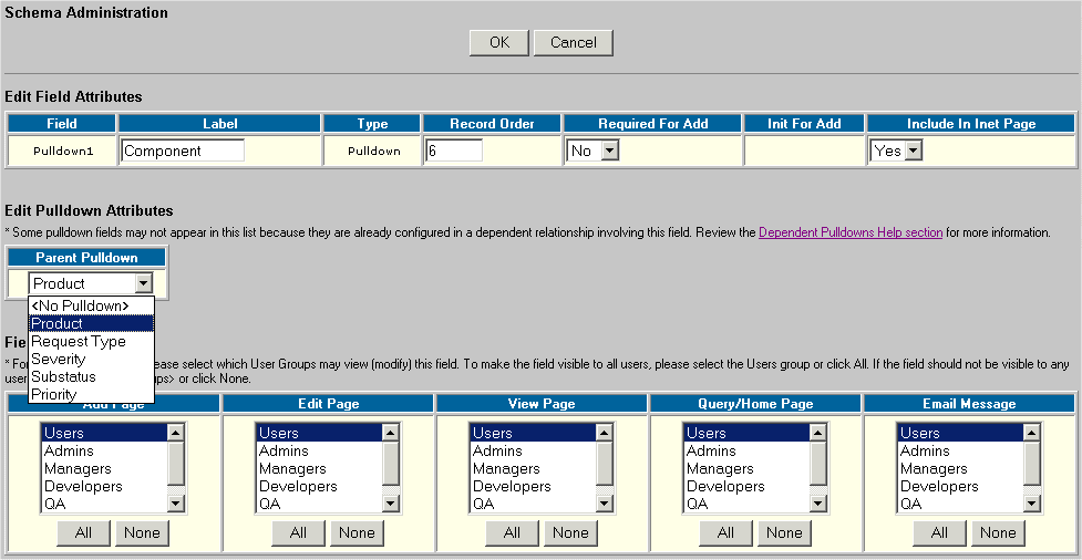 Using the sample hierarchy above, let's say the Component field was changed to have another field, Severity, in the Parent Pulldown attribute in the Define Record section. The option menu items of Component will be independent of the associations that existed with Product. However, the associations between the option menu items of Component and levels below it will be preserved.